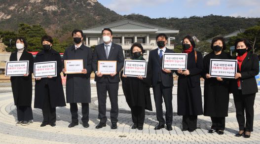 국민의힘 초선의원들이 27일 청와대 앞에서 문재인 대통령에게 전달할 질의서와 손피켓을 들고 시위하고 있다.(사진=국회사진기자단) |
