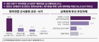 아울러 응답자 중 66.5%는 “내년 상반기 한미연합군사훈련이 예정대로 진행돼야 한다”고 답했다. 훈련규모를 축소하거나 연기해야 한다는 의견은 28.7%에 그쳤다. 미국 대선 이후 북한의 도발 가능성이 점쳐지고 있는 가운데 국내외 전문가들은 한미연합군사훈련이 예정돼있는 내년 3월이 북미관계의 중대 분수령이 될 것이라고 예측하고 있다.