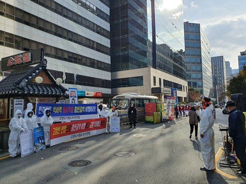 코로나19 확산으로 인해 10명 미만만 참여할 수 있는 가운데 방역복과 쉴드마스크를 착용하고 기자회견을 진행하였다.