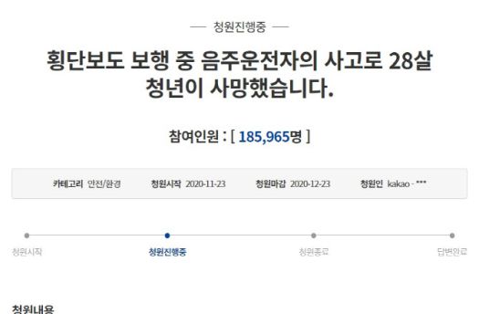 23일 청와대 국민청원 게시판에 ‘횡단보도 보행 중 음주운전자의 사고로 28살 청년이 사망했습니다’라는 글이 올라왔습니다. 청원인은 “11월 6일 한국에 온지 5년 된 외국인 친구가 횡단보도의 초록색 신호에 맞춰 길을 건너는 중 음주운전자의 차량에 손써볼 겨를도 없이 사망했다”라며 “친구의 부모님께서 들으실 수 있었던 말은, 사연은 안타깝지만 가해자가 ‘음주’인 상태에서 사고가 일어났기 때문에 처벌이 오히려 경감될 수 있다는 말뿐이었다”고 적었습니다.