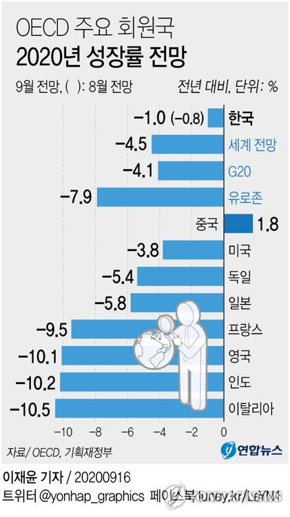 OECD는 지난 9월 한국의 올해 성장률 전망치를 -1.0%로 예상한 바 있다. 이는 기존 -0.8%에서 0.2%포인트 내린 수치다. 8월 중 코로나19 2차 확산을 반영한 결과다. 이번 3차 확산을 반영해 추가로 전망치를 낮출 가능성도 있다.