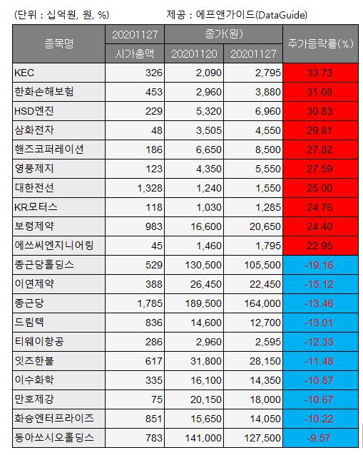 한 주간 코스피시장에서 가장 많이 오른 종목은 KEC로, 33.73% 상승했다. 테슬라가 완전자율주행 베타5 정식버전을 출시한다는 소식에 관련주로 엮여 급등했다. KEC는 테슬라에 디지털콕핏이 적용된 터치스크린을 내년 초부터 공급할 예정으로 전해졌다.