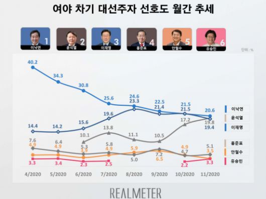 리얼미터는 오마이뉴스 의뢰로 지난 23~27일 전국 18세 이상 2538명을 대상으로 차기 대선주자 선호도를 조사한 결과, 윤 총장이 19.8%의 선호도를 기록, 20.6%를 기록한 이 대표에 이어 2위를 차지했다고 30일 밝혔다. 이재명 경기도지사는 19.4%로 전달보다 한단계 떨어진 3위에 랭크됐다. 1~3위까지 오차 범위(1.9%포인트) 내 접전이다.