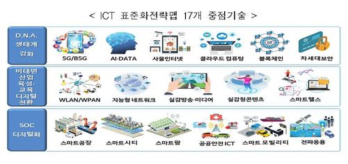 이번 표준화 전략맵은 데이터·네트워크·인공지능(D·N·A) 생태계 강화, 비대면 산업 육성·교육 디지털 전환, SOC 디지털화 등 17개 중점 기술과 275개 중점 표준화 항목을 포함한다.