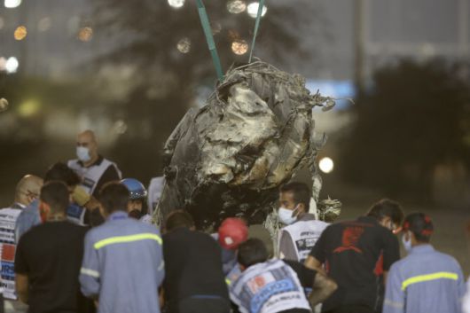 포뮬러원(F1) 바레인 그랑프리 도중 큰 사고를 당한 로맹 그로장이 구급요원의 부축을 받고 화염에 휩싸인 머신에서 빠져나오고 있다. 사진=AP PHOTOF1 드라이버 로맹 그로장의 탄 머신이 사고를 입은 뒤 화염에 휩싸여있다. 사진=AP PHOTO사고로 완전히 불에 탄 로맹 그로장의 F1 머신. 사진=AP PHOTO |