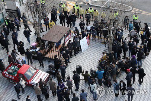 이들은 전씨의 혐의에 대해 법정 최고형인 징역 2년을 선고하고 법정 구속한다는 내용의 판결문 형식의 손팻말을 만들어와 전씨의 구속을 촉구했다.
