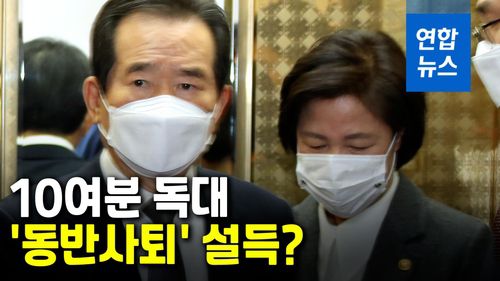 국무회의 예정 시각 15분 전인 오전 9시 45분께 정부서울청사에 온 추 장관은 정 총리의 집무실에서 10여분간 대화를 나누고 함께 회의장으로 입장했습니다.