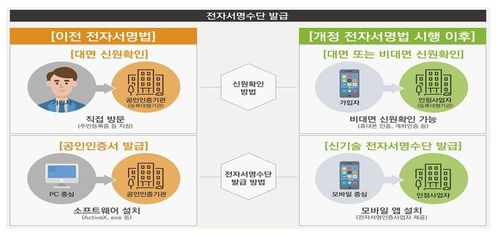(서울=연합뉴스) 정윤주 기자 = 공인인증서 폐지 이후 전자서명 사업자를 평가하는 기관의 선정 절차와 인정 기관의 업무수행 방법이 정해졌다. 주민등록번호 외에 계좌번호나 휴대전화 번호로도 신원을 확인하는 등 전자 서명에 가입하는 방법도 확대됐다.