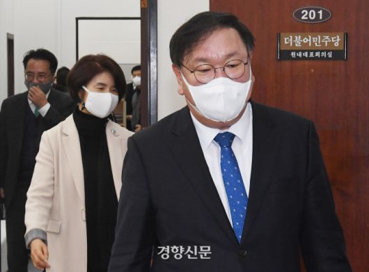 김태년 더불어민주당 원내대표가 27일 오전 국회에서 열린 원내대책회의에 참석하고 있다. 국회사진기자단 |