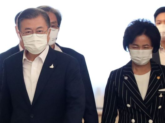 문재인 대통령과 추미애 법무부 장관이 9월 21일 청와대에서 열린 제2차 국정원·검찰·경찰 개혁 전략회의 회의장에 나란히 입장하고 있다. /연합뉴스 |