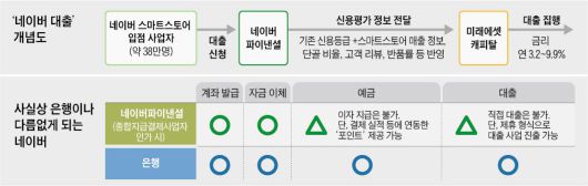 네이버 자회사인 네이버파이낸셜은 미래에셋캐피탈과 제휴해 네이버 스마트 스토어 사업자를 위한 신용 대출 상품 ‘미래에셋캐피탈 스마트스토어 사업자 대출’을 시작한다고 1일 밝혔다. 자사 온라인 쇼핑몰에서 상품을 파는 중소 상공인 사업자 38만명에게 대출해주겠다는 것이다. 담보나 보증은 필요없는 ‘신용’ 대출이다.