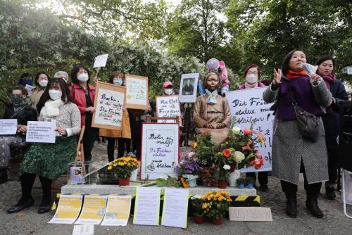 독일 베를린에 있는 ‘평화의 소녀상’ 앞에서 시민이 10월 13일(현지시간) 철거 결정에 항의하고 있다. 베를린 미테구의회는 1일 평화의 소녀상 영구 설치 결의안을 의결했다. 베를린/EPA연합뉴스 |