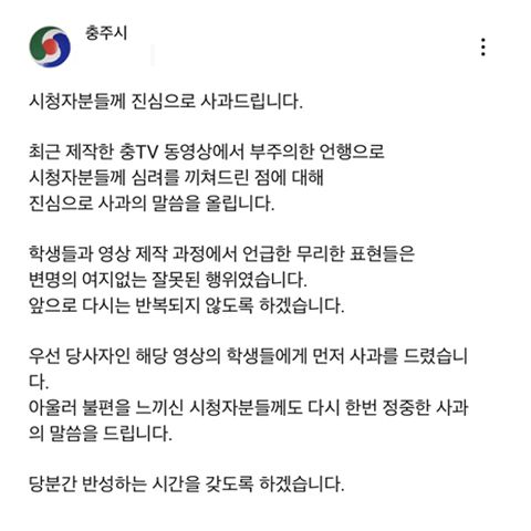 충주시는 "우선 당사자인 해당 영상의 학생들에게 먼저 사과를 드렸다. 아울러 불편을 느끼신 시청자분들께도 다시 한번 정중한 사과의 말씀을 드린다"며 "당분간 반성하는 시간을 갖도록 하겠다"고 말했다.