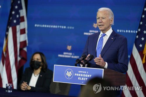 (서울=연합뉴스) 안용수 기자 = 조 바이든 미국 대통령 당선인이 적극적인 경기 부양책과 일련의 행정명령을 통해 취임 초 빠르게 국정 운영을 '정상 궤도'에 올려놓는다는 방침을 세운 것으로 전해졌다.