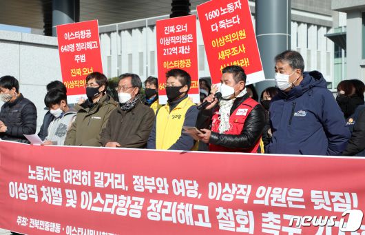 (전주=뉴스1) 유경석 기자 = 전북민중행동과 이스타시민사회공대위 관계자들이 2일 전북 전주시 전주지방검찰청 앞에서 '이상직 처벌 및 이스타항공 정리해고 철회' 촉구를 외치고 있다. 2020.12.2/뉴스1