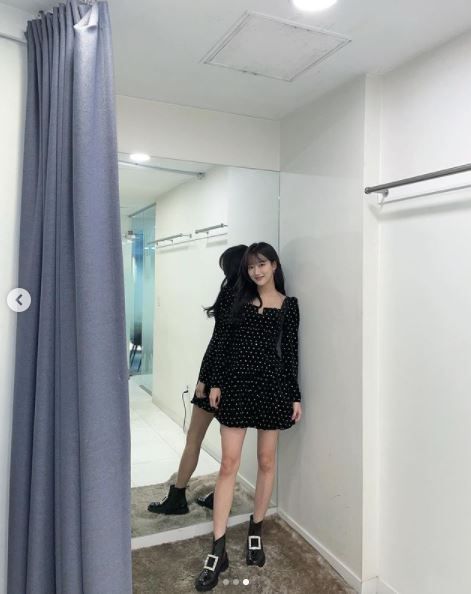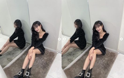 사진 속 이나은은 짧은 도트 무늬의 미니 원피스를 입고 바닥에 앉아 포즈를 취하고 있다. 그의 완벽한 비주얼과 가녀린 다리 라인이 시선을 집중시킨다.
