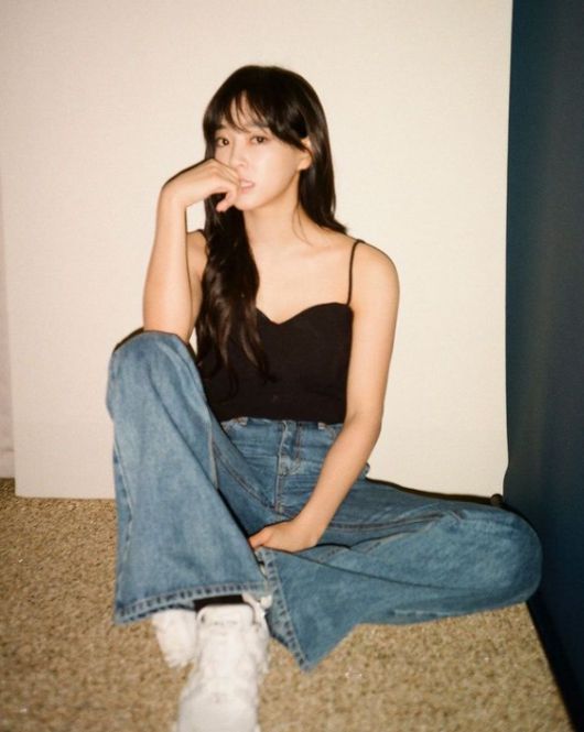 사진 속 김세정은 끈 나시에 데님팬츠를 입고 카메라를 향해 포즈를 취하고 있다.
