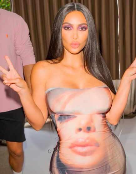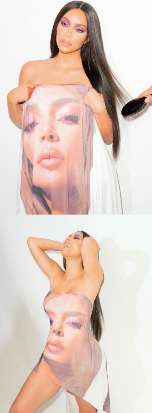 사진 속 킴 카다시안은 자신의 유명한 얼굴 이미지가 프린트된 드레스를 입고 카메라를 향해 포즈를 취하고 있다. 어깨와 허벅지 등이 노출된 이 드레스를 통해 킴 카다시안 특유의 골반과 엉덩이 라인이 돋보인다.