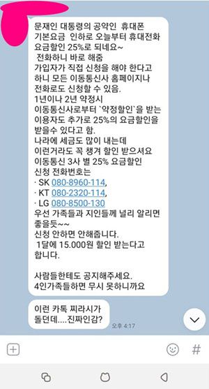 우선 '추가로 25% 요금 할인을 받을 수 있다'는 내용은 허위 정보다. 정부는 2017년 말 통신비 인하 정책에 따라 선택약정 할인율을 20%에서 25%로 이미 상향 조정했다. 가입자는 휴대폰을 새로 구입할 때 공시지원금과 선택약정 할인 중 하나만 고를 수 있다. 선택약정 할인을 추가로 받을 수 있는 제도는 애당초 없다.