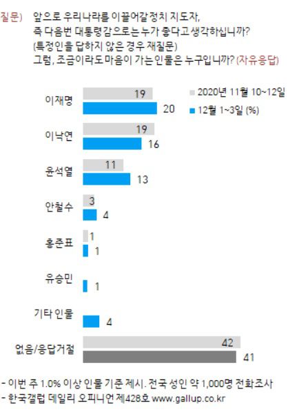 4일 한국갤럽은 2020년 12월 첫째 주(1~3일) 전국 만 18세 이상 1,000명에게 앞으로 우리나라를 이끌어갈 정치 지도자, 즉 다음번 대통령감으로 누가 좋다고 생각하는지 물은 결과를 발표했다. 이재명 경기도지사는 20% 그 뒤를 이낙연 더불어민주당 대표(16%), 윤석열 검찰총장(13%), 안철수 국민의당 대표(4%), 홍준표 무소속 의원, 유승민 전 국민의힘 의원(이상 1%)이 이었다. 4%는 그 외 인물(1.0% 미만 약 20명 포함), 41%는 특정인을 답하지 않았다.