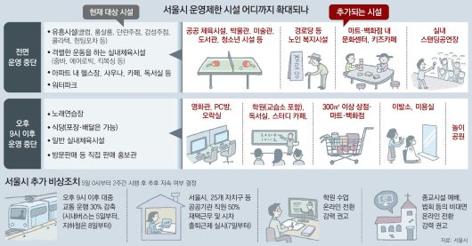 이에 따라 다수가 이용하는 생활시설 상당수가 오후 9시부터 다음 날 5시까지 문을 닫는다. 영화관이나 놀이공원, PC방, 오락실, 이발소·미용실, 상점·마트·백화점(300m² 이상) 등이 대상이다. 음식점과 카페, 실내체육시설 등에 내린 오후 9시 이후 운영 중단 조치도 계속된다. 유흥시설의 집합금지 명령도 이어진다. 서울시 관계자는 “필수적인 생필품 구입을 위해 300m² 미만 소규모 마트 운영과 음식점 포장, 배달은 허용한다”고 말했다.