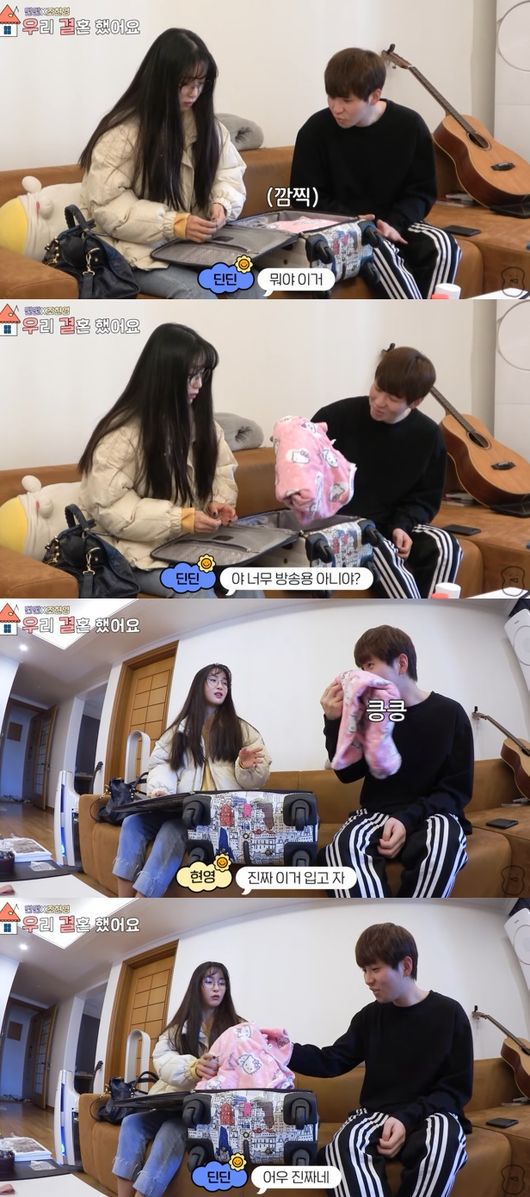 영상은 딘딘과 조현영의 결혼 생활 시작 5분 전부터 시작됐다. 벨이 울리자 딘딘은 “왜 이렇게 빨리 와”라며 투덜댔다. 조현영이 들어오자 딘딘은 “왜 수줍은 척 하느냐”며 괜히 조현영의 캐리어를 열어봤다. 딘딘은 조현영의 잠옷을 보고 “너무 방송용 아니냐”고 지적했고, 진짜로 입는 옷이라고 하자 냄새를 맡으며 “어 진짜네?”라고 말했다.