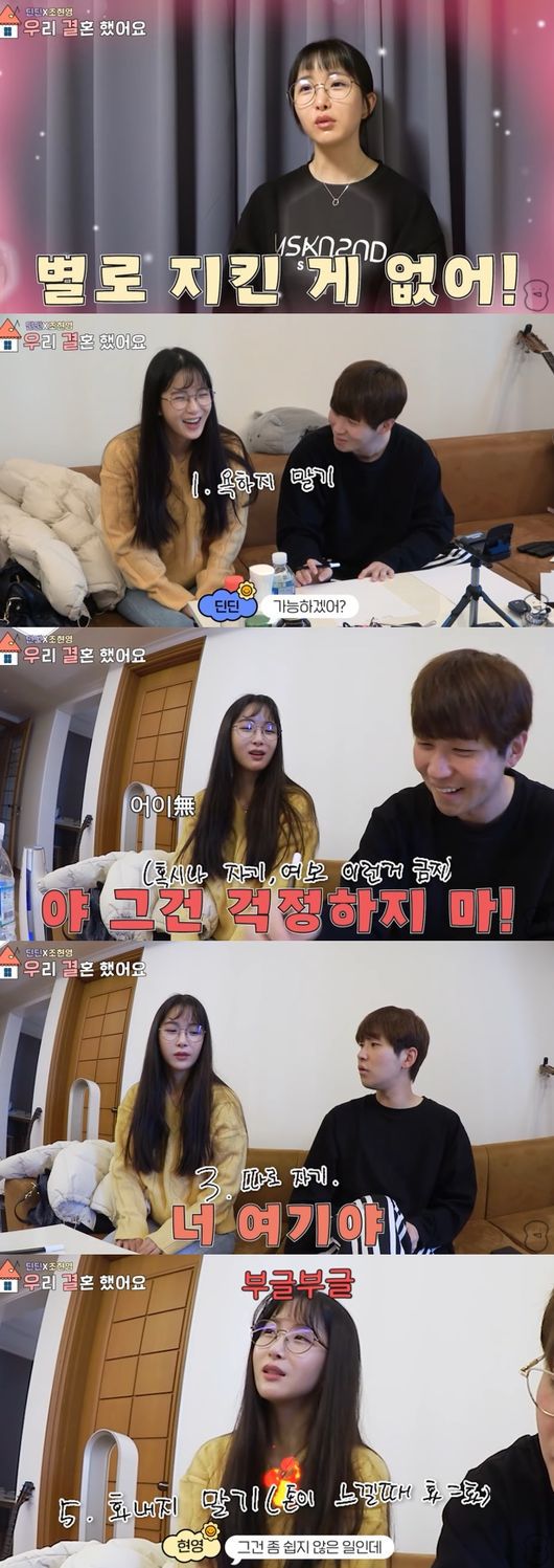 ‘우리 결혼했어요’에 앞서 딘딘과 조현영은 금지 사항을 적은 서약서를 작성했다. ‘욕하지 않기’, ‘애칭 및 애교 금지’, ‘잘 때 따로 자기’, ‘주사 부리지 않기’, ‘화내지 않기’, ‘단점 지적하지 않기’, ‘명령어 금지’, ‘부부임을 잊지 않기’, ‘결혼이 끝나서 슬퍼도 감정을 원점으로 돌리기’ 등 10가지 규칙이 만들어졌다.