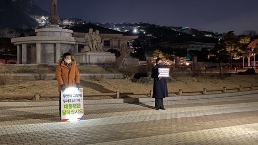 국민의힘 최승재 의원과 김은혜 의원이 지난달 27일 밤 청와대 앞에서 손피켓을 들고 시위하고 있다. (사진=국민의힘) |
