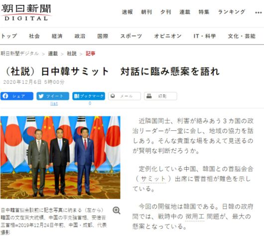 신문은 “정례화된 중국, 한국과의 정상회담 참석에 스가 총리가 난색을 보이고 있다”며 올해 한·중·일 정상회담 개최 예정지는 한국으로, 한·일 정부 간에 전시 징용공(징용 노동자의 일본식 표현) 문제가 현안이 되고 있다고 전했다. 신문은 “일본 정부는 이 문제에 대해 한국 측이 구체적인 해결책을 제시하지 않으면, 스가 총리가 한국을 방문할 수 없다고 밝혔다”며 “양국 간에 놓인 징용문제를 조속히 해결해 관계 개선을 도모할 필요가 있는 것은 논할 필요도 없다. 정치적 사정으로 경제와 시민 교류를 더는 지체할 수 없다”고 했다.