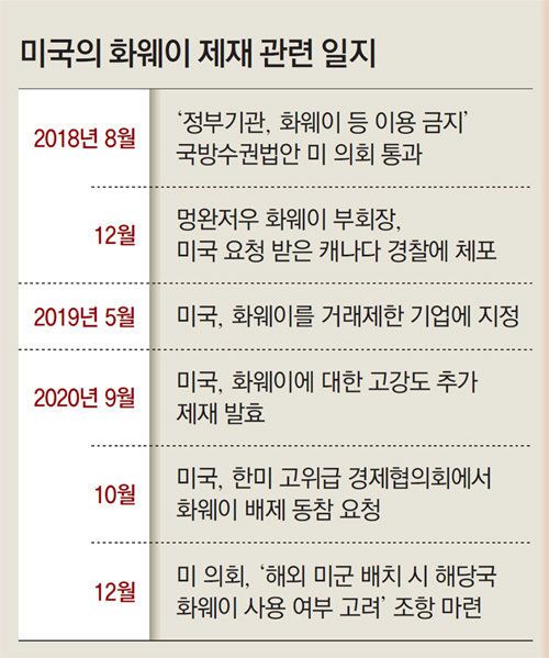 미국 의회가 앞으로 해외에 미군 병력이나 주요 군사장비를 배치할 때 주둔 국가에서 화웨이 등 중국 기업의 5세대(5G) 이동통신 기술을 사용하는지를 고려해야 한다는 조항을 마련했다. 미국 정부로부터 화웨이 장비 퇴출을 요구받아 온 한국으로선 부담이 더욱 커질 것으로 보인다.