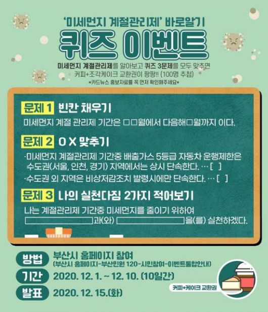 부산시는 오는 10일까지 부산시 홈페이지에서 ‘계절관리제 바로 알기’ 온라인 퀴즈 이벤트도 진행한다.
