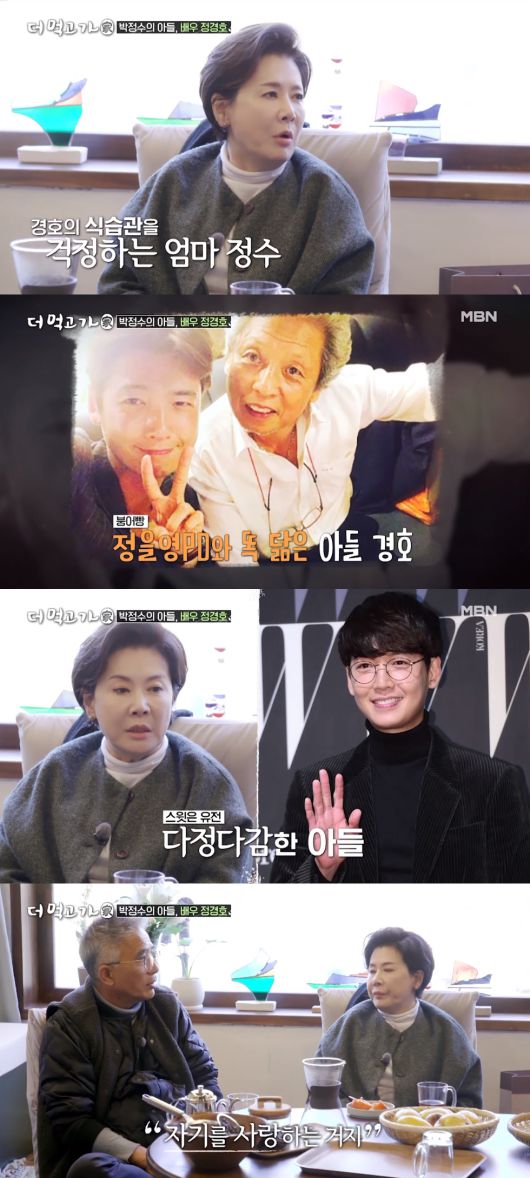 박정수는 정경호를 떠올리며 "행동이 아버지랑 똑같다. 하는 짓, 손짓까지 똑같아 분신같다"며 연인 정을영 PD도 언급했다.또 "또 아들이 씹는 걸 싫어한다. 꿀떡 삼키는거 보니 귀찮은가 보다"라며 정경호의 식습관을 걱정하는 면모도 보였다.