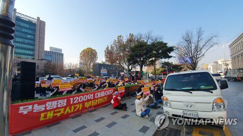 (대구=연합뉴스) 이덕기 기자 = 7일 대구시청 앞에서 대구 서구 내당3지구 지역주택조합 조합원들이 개발사업이 지연되는 것과 관련해 대구시를 규탄하는 집회를 하고 있다. 2020.12.7 duck@yna.co.kr <저작권자(c)연합뉴스. 무단전재-재배포금지.>