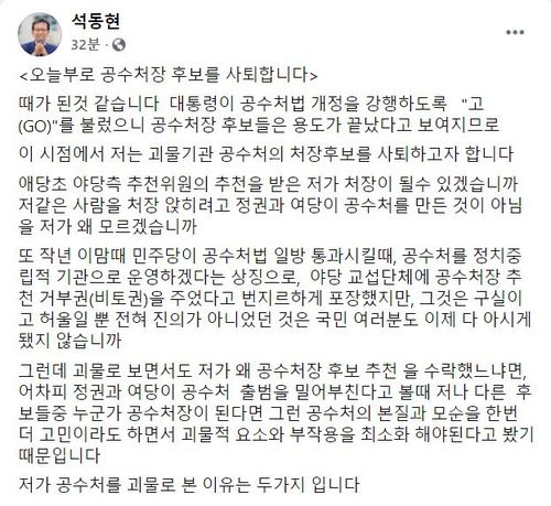 석 변호사는 8일 공수처장 추천위의 의결 정족수를 3분의 2로 완화하는 공수처법 개정안이 국회 법사위 안건조정위를 통과한 직후 페이스북에 글을 올려 "때가 된 것 같다. 이 시점에서 괴물기관 공수처의 처장 후보를 사퇴하고자 한다"고 적었다.