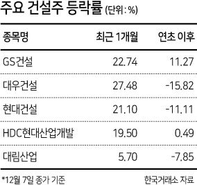8일 한국거래소에 따르면 GS건설 등 주요 건설주들의 주가는 최근 1개월간 큰 폭으로 뛰었다. GS건설의 7일 종가는 3만4550원으로 1개월 전 대비 22.74% 상승했고 대우건설(27.48%)과 현대건설(21.10%), HDC현대산업개발(19.50%), 대림산업(5.70%) 등도 강세를 보였다.