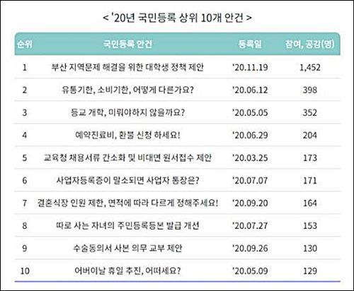 이 외에도 코로나19로 인한 '대학 등록금 반환' 안건을 비롯해 '1회용 컵 보증금 제도', '비비탄총 안전사고 예방', '택배 종사자 근로환경 개선' 등의 안건이 국민들의 관심을 받았다.