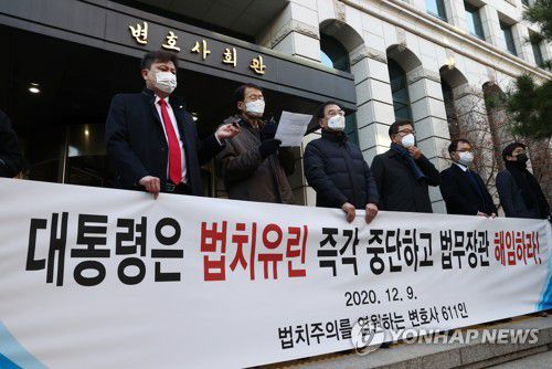 (서울=연합뉴스) 박형빈 기자 = 전직 대법관과 검찰총장 등을 포함한 변호사 600여 명이 윤석열 검찰총장에 대한 징계 철회와 추미애 법무부 장관의 해임을 촉구하고 나섰다.