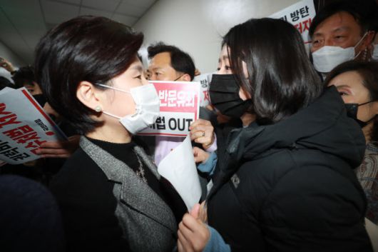 국민의힘 의원들이 공수처법 개정에 반대하며 농성 중인 지난 7일 국회 법제사법위원회 법안심사제1소위 회의실 앞에서 배현진 의원(오른쪽)이 더불어민주당 소속 백혜련 법사위 법안심사1소위원장을 막아 서고 있다 (사진=연합뉴스) |