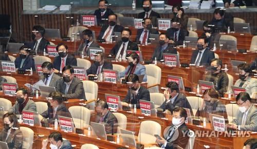 의원석 앞에 '공수처법 저지' 피켓 붙인 국민의힘 |