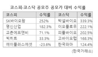 코스닥 공모주의 평균수익률은 40.57%로 집계됐다. 수익률 상위 업체는 바이오업종 일색이다. 박셀바이오 주가가 공모주에 비해 339.3%나 급등했고 이오플로우(222.1%), 피플바이오(202.5%), 고바이오랩(168.3%), 한국파마(124.4%) 등 1~5위 업체가 모두 바이오 업체였다.