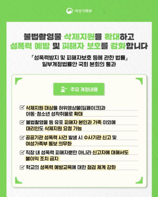 여성가족부(장관 이정옥)는 디지털 성범죄 피해자에 대한 지원을 확대하는 등의 성폭력방지 및 피해자보호 등에 관한 법(이하 성폭력방지법) 일부개정법률안이 9일 국회 본회의를 통과했다고 밝혔다. 이번 개정 법률은 공포 후 6개월이 경과한 날부터 시행된다.
