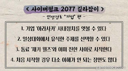 게임메카는 사이버펑크 2077의 방대한 오픈월드에 뛰어드는 유저분들을 위해 인생경로 길라잡이가 되어드리고자 합니다. 광활한 황무지를 내달리는 액션이 인상적인 노마드, 주변 NPC와 친밀감 형성을 제대로 느낄 수 있는 부랑아 그리고 거대 기업의 일원으로 전문적인 대화가 가능한 기업까지, 각 인생경로별 특징과 초반 플레이를 영상으로 공개합니다.