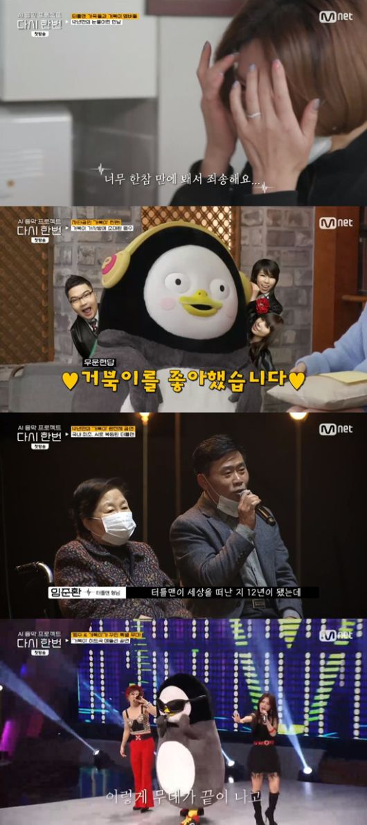 9일 첫 방송된 Mnet '다시 한번'은 그리운 아티스트의 음성과 모습을 복원해 새로운 곡과 무대를 선보이는 프로젝트. 1회는 2008년 세상을 떠난 그룹 거북이의 리더 故터틀맨 임성훈이 등장, 거북이의 12년 만의 완전체 무대가 공개됐다.