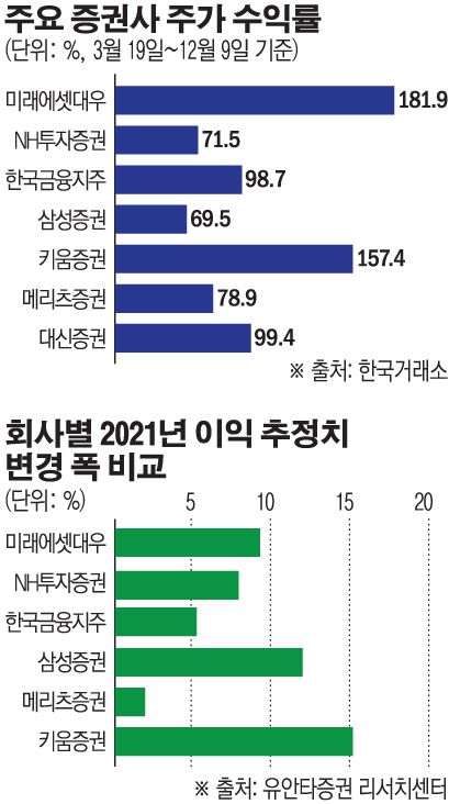 이어 국내에서 사장 높은 개인투자자 점유율을 가진 키움증권이 지난 3분기 증권업계 영업이익 1위, 자기자본이익율(ROE) 1위 등을 기록하면서 주가가 가파르게 상승, 3월 19일 이후 주가 수익률은 157.5%에 달했다.