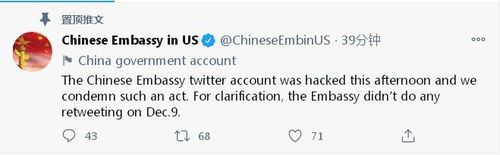 주미 중국대사관 측은 논란이 확산하자 대사관 트위터 계정이 해킹당했다고 해명하며 상황을 수습하고 나섰다.