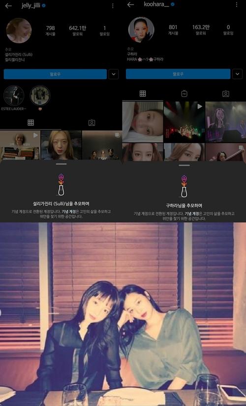 최근 설리와 구하라의 인스타그램에는 '추모'라는 단어가 추가됐다. 이를 클릭하면 '설리 님을 추모하며', '구하라 님을 추모하며'라고 소개된 설명창이 뜨고 "기념 계정으로 전환된 계정입니다. 기념 계정은 고인의 삶을 추모하고 위안을 찾기 위한 공간입니다"라는 글이 이어진다.