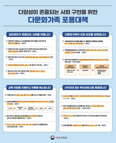 여성가족부는 외교부와 교육부, 국방부, 행정안전부 등 관계부처와 함께 이 같은 내용을 담은 '다문화가족 포용대책'을 11일 발표했다.