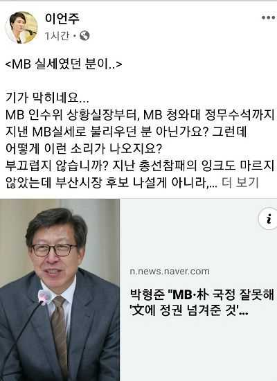 이 전 의원은 11일 자신의 페이스북에 박 교수 발언을 다룬 기사 링크와 함께 'MB실세였던 분이…'라는 제목으로 게시글을 올렸다.