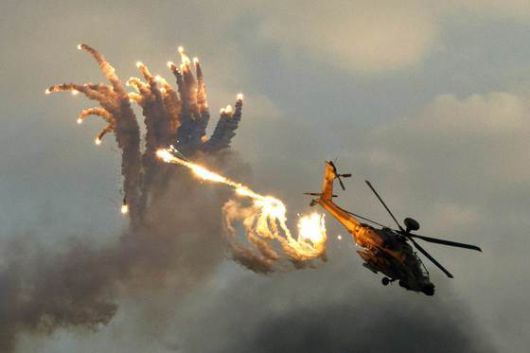 에어쇼에 참가한 이스라엘군 아파치 헬기가 미사일을 피해 플레어(flares)를 터뜨리며 빠른 속도로 회피기동하는 모습을 선보이고 있다. [연합뉴스] |