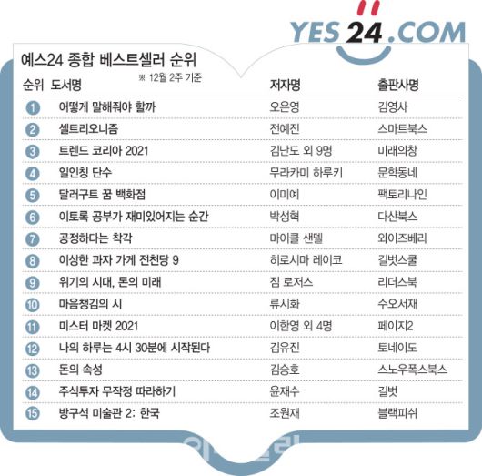 뒤를 이어 서울대 소비트렌드 분석센터가 2021년 트렌드를 전망한 ‘트렌드 코리아 2021’(3위), 무리카미 하루키의 신작 ‘일인칭 단수’(4위), 어른을 위한 힐링 판타지 소설 ‘달러구트 꿈 백화점’(5위)가 차례로 ‘톱 5’에 이름을 올렸다.